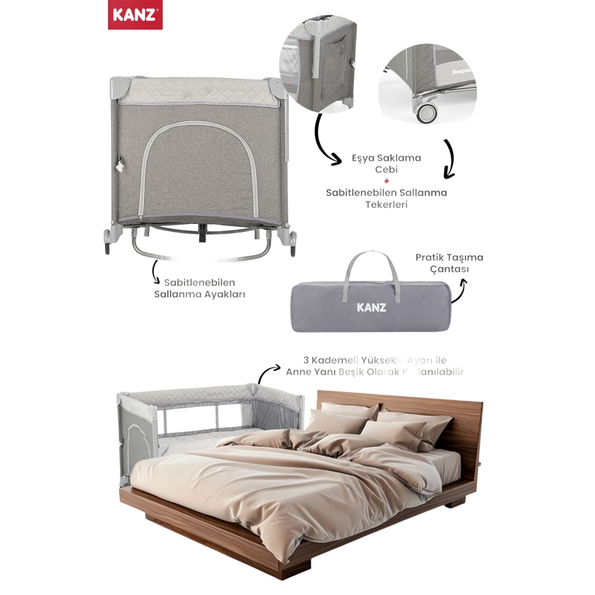 Anne yanı olarak kullanıldığında fermuarlı ön paneli indirerek, gece boyunca bebeğinize kolayca ulaşıp onu besleyebilir ve sakinleştirebilirsiniz.